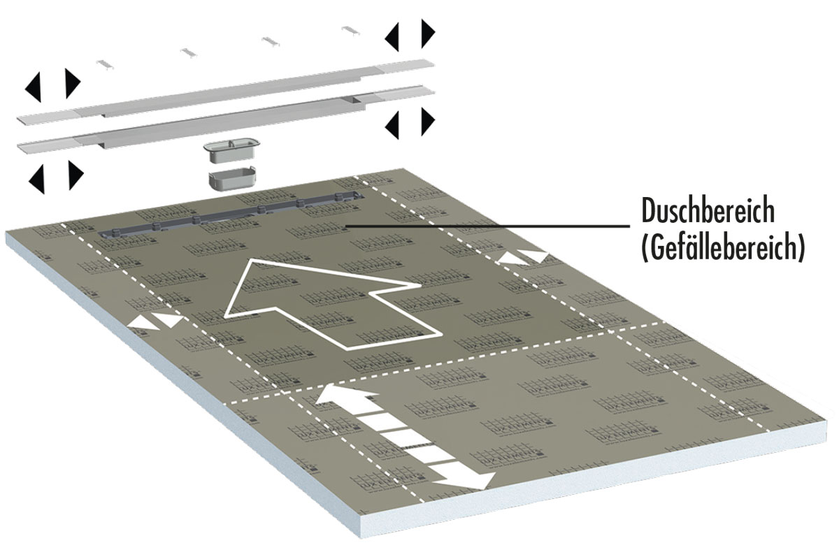 Bodengleiche Duschböden im Langformat mit einseitigem Gefälle, an den Seiten und in der Länge kürzbar durch Bereich ohne Gefälle, mit eingebauter und eingedichteter Bodenablaufrinne.