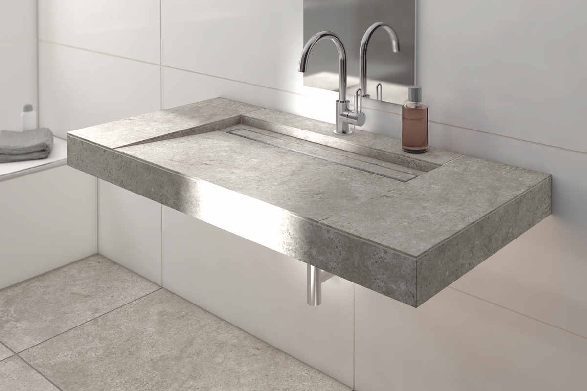 The floor channel drain is already integrated in the model with linear drainage. The reversible channel cover offers two design possibilities: One side has a brushed stainless steel surface, the other can be tiled to match the entire washstand. By simply turning, the desired side faces upwards.