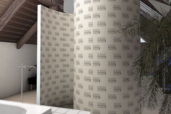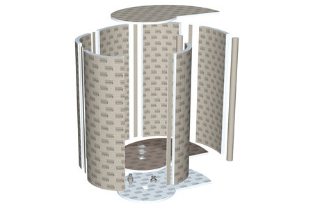 RELAX-SD is a building kit for a curved shower, left-curving or right-curving, consisting of a shower base element, factory sealed, prefabricated gradient and floor drain fitting frame and shower partition wall element in 6 segments with a stable connection.