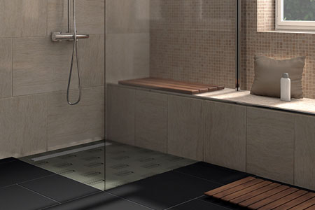 The TUB-LINE COMBI models combine a shower base element with an integrated and sealed floor channel drain, including integrated horizontal floor drain support with odour trap.