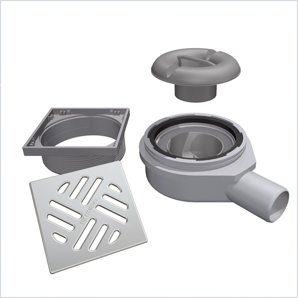 En alternative aux systèmes d’écoulement à combiner librement, la grille standard est disponible sous forme de kit complet avec support de grille et siphon de sol vertical ou horizontal.