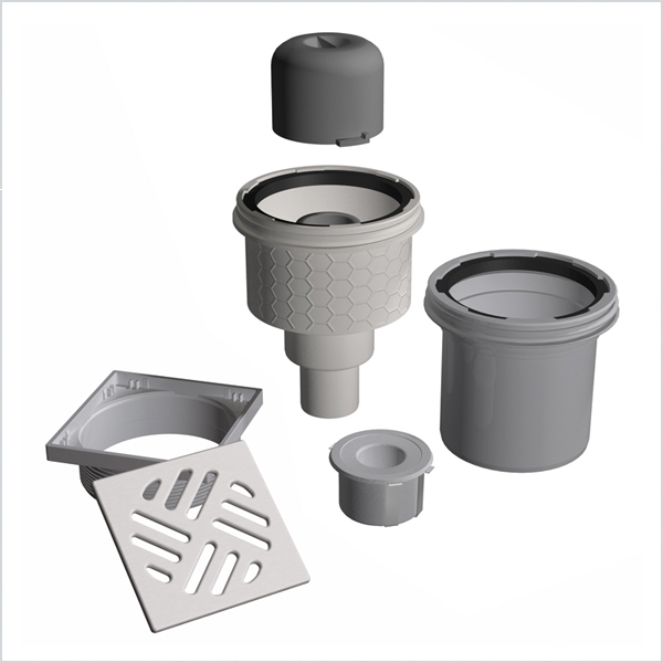 Siphon de sol DN 50 pour carottage ≥160 mm, vertical, avec obturateur d’odeurs, y compris support de grille en ABS et grille standard en acier inoxydable, inclus protection incendie.
